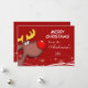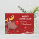 Rudolf the red nosed reindeer character on a red snowy background. Cute Christmas greeting card design.
