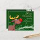 Rudolf the red nosed reindeer character on a green snowy background. Cute Christmas greeting card design.