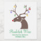 Whimsical but still elegant enough for your homemade wine.  It features a white background with a Rudolph silhouette done in brown with a red nose.  Colourful ornaments hang from his antlers.  The bottom has customisable green text.