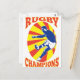 graphic design illustration of a rugby player kicking ball done in retro style with words rugby champions