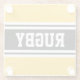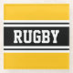 This sporty, athletic design features bold RUGBY text inside a highlighted black and white racing stripes against bright yellow outer stripes. The text in this design can be personalised.