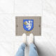 Spanish surname Ruiz Historical Shield Floormat displays a silver lion grasping a gold Fleur de Lis on a blue field set on a cobblestone style background. The Spanish surname Ruiz derives from the word Roderick meaning one who has fame.