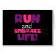 If you love to run, run 5Ks, 10Ks, half marathons, or marathons, you'll love this colourful text design in purple and pink that reads Run and Embrace Life!