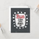 A cute typographic design that says "Run Like You Mean It". It features black and red text on a white rectangle with funky, playful white dots surrounding it, all on a grey background.