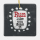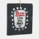 A cute typographic design that says "Run Like You Mean It". It features black and red text on a white rectangle with funky, playful white dots surrounding it, all on a grey background.