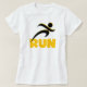 Running T-shirts, mugs, bags, keepsakes, tank tops, hoodies, and other apparel and gifts for runners featuring a black silhouette runner and yellow text that reads RUN. These RUN apparel and gift items are great for anyone training for a 5K, anyone who just loves to run, or someone who has already accomplished several marathons!