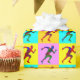 Multi-colored silhouettes of runners on the background of multi-colored squares