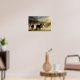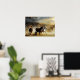 Beautiful artwork of horses running across the plains. Golds, brown, and a grey blue.