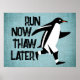 Run Now Thaw Later motivational poster with a cute running penguin. Design by Ellen Marcus