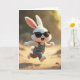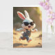 Designed with a lively outdoor scene, this card features a white rabbit-like character 🐰 dashing across warm, sunlit sand, its soft fur glowing gold with pink inner ears and paw pads. The character’s wide grin and forward-leaning stride feel like it’s racing toward a friend, as if sharing a secret joke mid-run. In the upper center, a short Easter greeting sits in a light pastel tone, while a smaller line of text appears near the bottom in a deeper shade for contrast. Dark sunglasses add a cool twist, and denim-style overalls with tiny white buttons and shiny clasps give it a cozy, down-to-earth look. Behind the runner, the background fades into gentle earthy browns and soft greens, suggesting distant plants and open space under early or late sunlight 🌷. The blurred horizon and glowing light keep the focus on the character’s motion, with sandy highlights sparkling around its feet. A soft, golden sky washes over the scene while the rabbit’s sunglasses catch a small bright gleam.