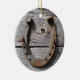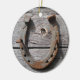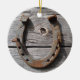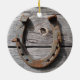 This hanging ornament features the image of an old horseshoe with red rust on its surface. The horseshoe hangs on an old wall of aging silver knotted wooden planks. The design is on a hanging ornament that's ideal for the Christmas tree.