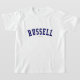 Russell! Is your name Russell? Or do you have a husband, boyfriend, male family member or male friend named Russell? If so, this "Banner" shirt is exactly the gift that you're looking for! The design features "Russell" in arched navy lettering across the chest in the classic College font.