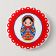 This Matryoshka button is in red, blue, yellow and white colours. The button is designed with matryoshka, Russian nesting doll on lace background.