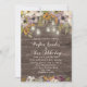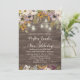 Beautiful wedding invitation designed with a rustic wood background. Rust, purple, and ivory cream-coloured watercolor flowers, sage green leaves, and string lights and lanterns top of this country wedding design.