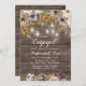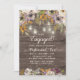 Beautiful engagement party invitation designed with a rustic wood background. Rust, purple, and ivory cream-coloured watercolor flowers, sage green leaves, and string lights and lanterns top of this country wedding design.
