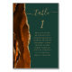The left-hand edge of this elegant modern wedding table number card features a burnt orange and rust watercolor agate border trimmed with faux gold glitter. The word "table" appears in gold-coloured handwriting script on a dark green background. Add the names of your guests who are assigned to each table.