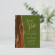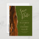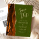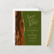 This elegant modern save the date postcard features a burnt orange and rust watercolor agate border trimmed with faux gold glitter. Easily customise the gold-coloured text on an olive green background. On the reverse side, edit the customisable return address and enter your wedding website URL to generate a QR code your guests can scan to learn more about your upcoming event.