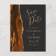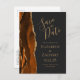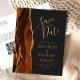 This elegant modern save the date postcard features a burnt orange and rust watercolor agate border trimmed with faux gold glitter. Easily customise the gold-coloured text on an off-black background. On the reverse side, edit the customisable return address and enter your wedding website URL to generate a QR code your guests can scan to learn more about your upcoming event.