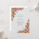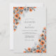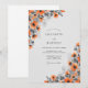 This design features a striking balance of vibrant blooms and muted foliage, creating a sophisticated autumnal mood. The palette showcases rich rust orange poppies paired with charcoal gray botanical elements. Delicate watercolor washes bring life to the floral clusters, providing a romantic and artistic feel.