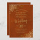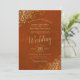 This beautiful wedding invitation features lacy gold script calligraphy and ornate golden faux foil curls and swirls on a marbled rust orange or burnt umber coloured background. Fancy, elegant, stylish and classy, the lush and glamourous feel of this invite is sure to impress your wedding guests.