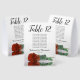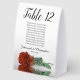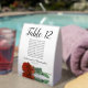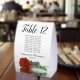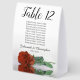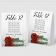 These tent table number signs are not only beautiful, they even include a list of names for the guests at each table, making it easy for your guests to find their seat at your wedding reception. The design is both elegant and romantic featuring a single rust orange or burnt umber coloured rose lying on its side reflecting in water with waves and ripples. The title is in lacy script calligraphy with bold numbers so your guests can easily find the right table. There is room for the names of the couple and the wedding date.