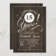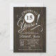 Rustic 15th anniversary party Invitation with dark brown wood pattern and white script font. Cheers to 15 years! Perfect for an elegant celebration.