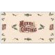 Christmas tablecloth for holiday parties with the Currier and Ives 1876 Merry Christmas message in rustic red and gold with holly and berries.