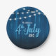 This 4th of July BBQ party paper plate features a rustic dark blue wood background accented with strings of lights. This is perfect for your family backyard barbecue this July 4th.