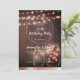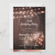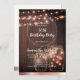 Rustic 50th birthday party invitation with string lights, mason jar glass wood grain background and a rose tint with rose gold metallic strip. Personalise this invite for any age. Rustic country style.