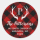Custom round return address stickers personalised with your family monogram and address. This modern rustic design features your monogram initial with deer antlers on a red and black buffalo check background. Use the design tools to change the background colour and fonts to further customise your own unique design. Perfect for addressing holiday cards, wedding stationery and more.