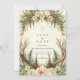 A rustic woodland wedding design featuring deer antlers, soft blush roses, ferns, and greenery. The natural elements and earthy tones create a romantic yet rugged atmosphere, perfect for boho, forest, or country-themed weddings.