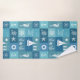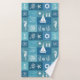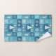 Vintage Nautical Icons Board Pattern Bath Towel Set. This design features a coastal board chequered with retro textured patchwork white summer symbols light blue seamless pattern designs in a mix of blue, white, aqua, and turquoise, the towels highlight boat anchor, seahorse, corals, shell, lack house and boat. This vintage nautical icons board monochrome blue Vector Pattern with classic turquoise blue and white colour scheme will be perfect as personalised gift.