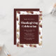 Rustic Thanksgiving Dinner Open House Invitation with a red burgundy background and a colourful fall foliage. With white typography lettering, you can add your own information. The back of the invitation has a customisable menu to share your cuisine choices with your guests. A fun autumn invite to celebrate with loved ones.