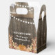 Rustic fall birthday favour boxes featuring a wooden background, string lights, autumn foliage & pumpkins, and a thank you template that is easy to customise.
