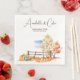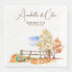 These rustic and romantic, Fall inspired wedding napkins feature a watercolor style image of an Autumn landscape. Trees with golden Fall colours of yellow and orange create a canopy over a wooden farm fence. Three pumpkins and a basket of apples are placed in front of the fence, on top of a pile of leaves.