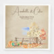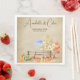 These romantic, Fall inspired wedding napkins feature a watercolor style image of an Autumn landscape. Trees with golden Fall colours of yellow and orange create a canopy over a wooden farm fence. Three pumpkins and a basket of apples are placed in front of the fence, on top of a pile of leaves. The background features a rustic parchment paper design.
