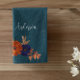 Rustic autumn floral: Navy blue and terracotta burnt orange floral with fall foliage. Features teal blue and modern script typography