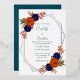 Rustic autumn floral wedding: Navy blue and terracotta burnt orange floral with fall foliage. Features teal blue and modern script typography