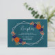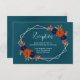 Rustic autumn floral wedding: Navy blue and terracotta burnt orange floral with fall foliage. Features teal blue and modern script typography