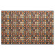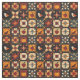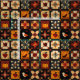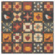 This fabric features a rustic patchwork quilt pattern arranged in a cosy grid of fabric blocks. Each block highlights unique autumnal motifs such as pumpkins, birds, apples, and hearts, alongside intricate geometric patterns including stars, squares, and floral or snowflake-inspired designs. Rendered in warm earthy tones of orange, red, brown, and cream against a deep dark background, the quilt captures the essence of fall and harvest season. With contrasting borders between the blocks, this farmhouse-style folk art design is perfect for Thanksgiving décor, rustic crafts, fabric-inspired DIY projects, and country-style autumn home design.
