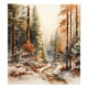 A watercolor rendition of 2 rustic-styled cabins in the woods during autumn.
