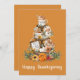 Whimsical cute happy Thanksgiving watercolor greeting card with tiered tray loaded with pumpkins, coffee mugs with spice sticks, pine needles, fall flowers, foliage and a quirky typeface. A cheerful Thanksgiving holiday theme for this year's day to give thanks.