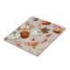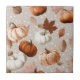 A cosy seamless pattern ceramic tile featuring pumpkins in shades of orange, cream, and muted grey, surrounded by autumn leaves. With a warm, earthy palette of burnt orange, soft creams, browns, and muted greens against a subtle background, this design captures the charm of the harvest season. Ideal for lovers of rustic fall aesthetics, farmhouse style, and seasonal autumn.