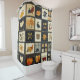 This autumn patchwork quilt-inspired shower curtain features warm seasonal motifs arranged in rustic squares. Pumpkins, birds, hearts, and floral branches appear alongside plaid and chequerboard blocks, with stars, snowflake-like shapes, and baskets adding charming variety. Rendered in earthy tones of orange, brown, cream, red, and black, it captures the cosy farmhouse aesthetic of the harvest season. Perfect for Thanksgiving, rustic country décor, fall crafts, and anyone who loves primitive folk art style.