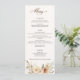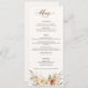 The romance of an Autumn wedding is captured in this elegant design featuring watercolor roses and greenery in warm Fall colours of terracotta, ivory, rust, chestnut, dusty blue and sage green with touches of gold sparkles. This design also features unique text graphics in a custom calligraphy script font with colour that can be customised in the design editor. Includes text fields for menu items.