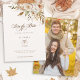 The romance of an Autumn wedding is captured in this elegant design featuring watercolor roses and greenery in warm Fall colours of terracotta, ivory, rust, chestnut, dusty blue and sage green with touches of gold foil sparkles. This design also features unique text graphics in a custom calligraphy script font with colour that can be customised using the designer editor.