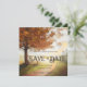 Save the date. Rustic walking path through a meadow with fall trees. Watercolor design with yellow, gold and orange.