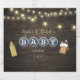 String lights header at top, gold bottle on left and frothy mug of beer on right on a rustic, dark wood. Blue and white bottle cap "Baby" typography. Templates created for you.