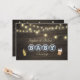 Rustic, dark wood with string lights header at top, gold bottle on left and foamy mug of beer on right. Blue and white bottle cap "Baby" typography. All templates created for you. Reverse side includes golden stars at top.