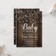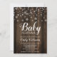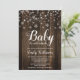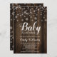 Rustic winter themed baby shower invitations. This trendy design features string lights and snowflakes on a dark wood background.